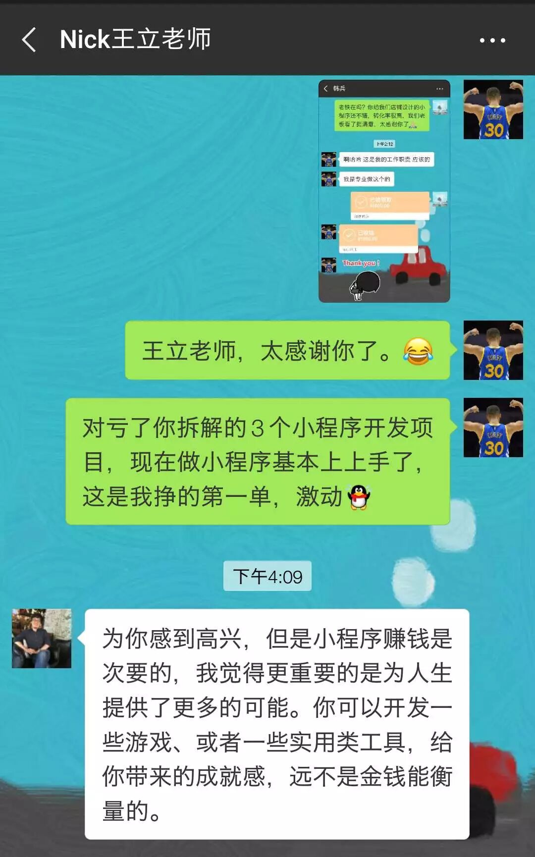 韩兵,刚毕业多久,在北京一家技术公司处于实习期,月薪6k,后来他听了王立老师的课后,通过学习小程序,赚得了人生的**桶金,俨然变成了“斜杠青年”。