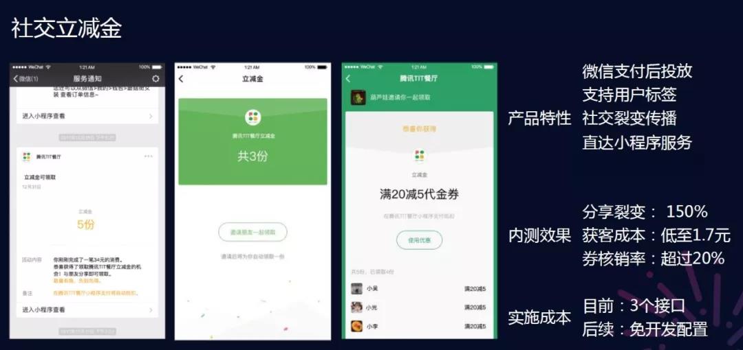 1.小程序帮助智慧零售打造会员服务、扫码购服务、到家服务、电商服务、微信礼品卡等多重能力,并正式开放“社交立减金”能力,并结合基于数据引擎的智能化尝试,让智慧零售实现“服务即生意”的理念和追求。