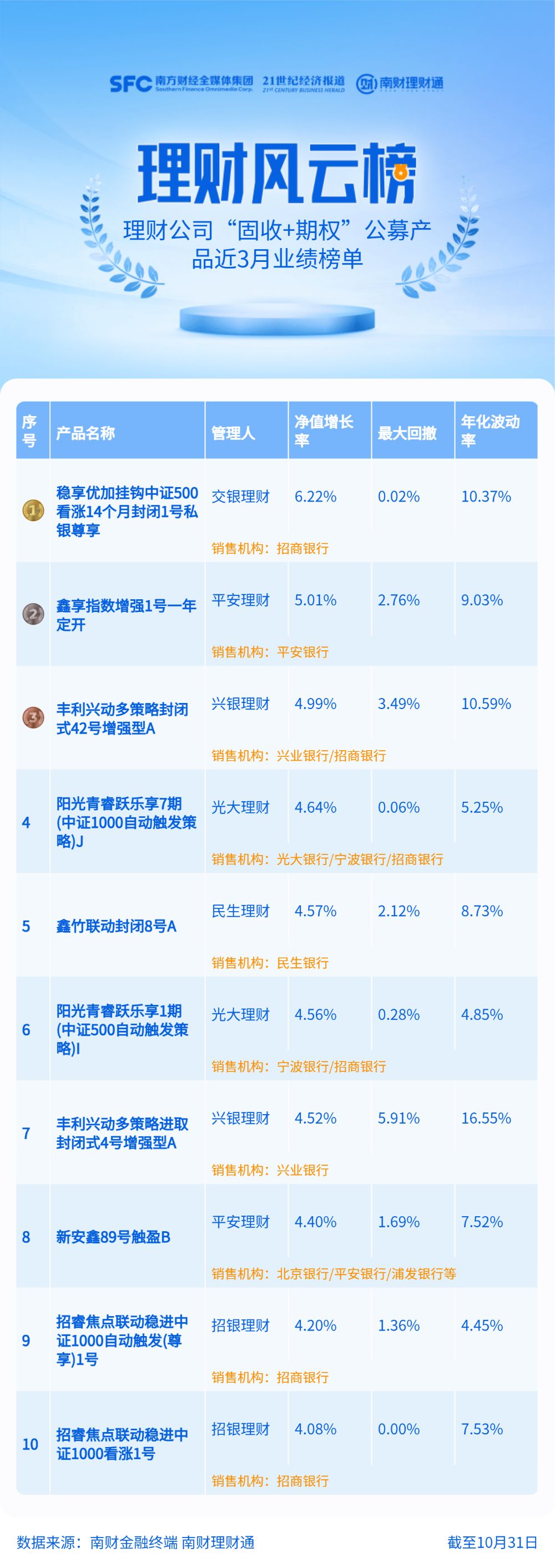 从单品表现看,交银理财“稳享优加挂钩中证500看涨14个月封闭1号私银尊享”、平安理财“鑫享指数增强1号一年定开”和兴银理财“丰利兴动多策略封闭式42号增强型A”位列前三,近3月净值增长率分别为6.22%、5.01%和4.99%。这三只产品均为股指挂钩产品。