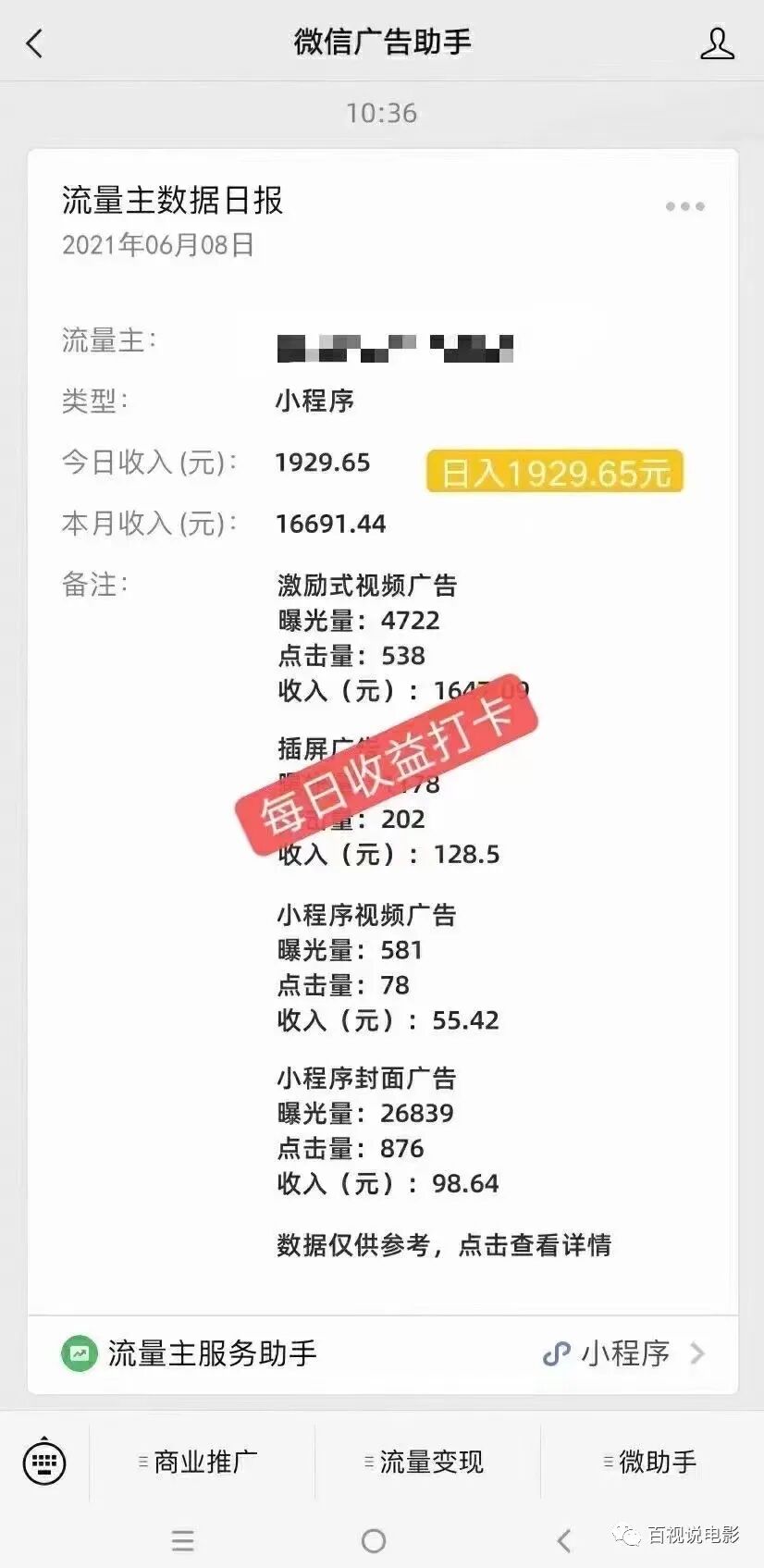小程序流量主赚钱的关键不止在于流量,还要看每天有多少人看到广告以及有多少次点击,刷不了,同一个用户每天会有点击次数限制。