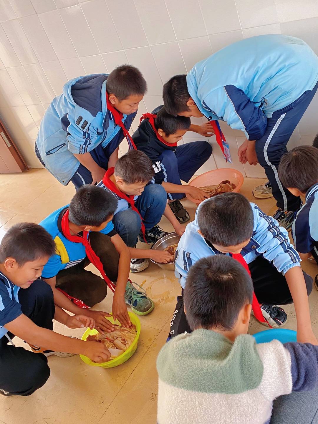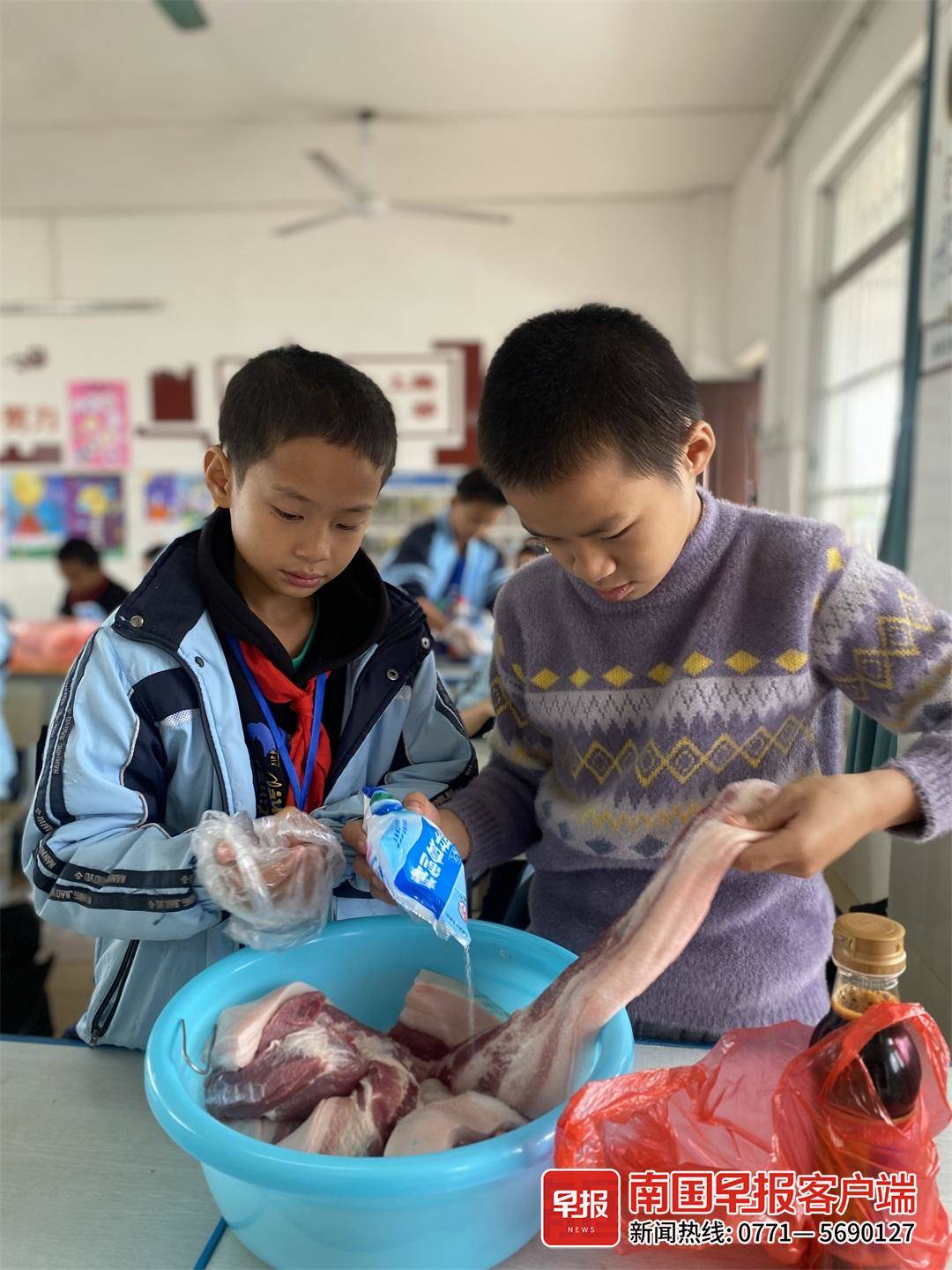 南宁市那马镇共和小学五年级学生正在腌肉。学校供图