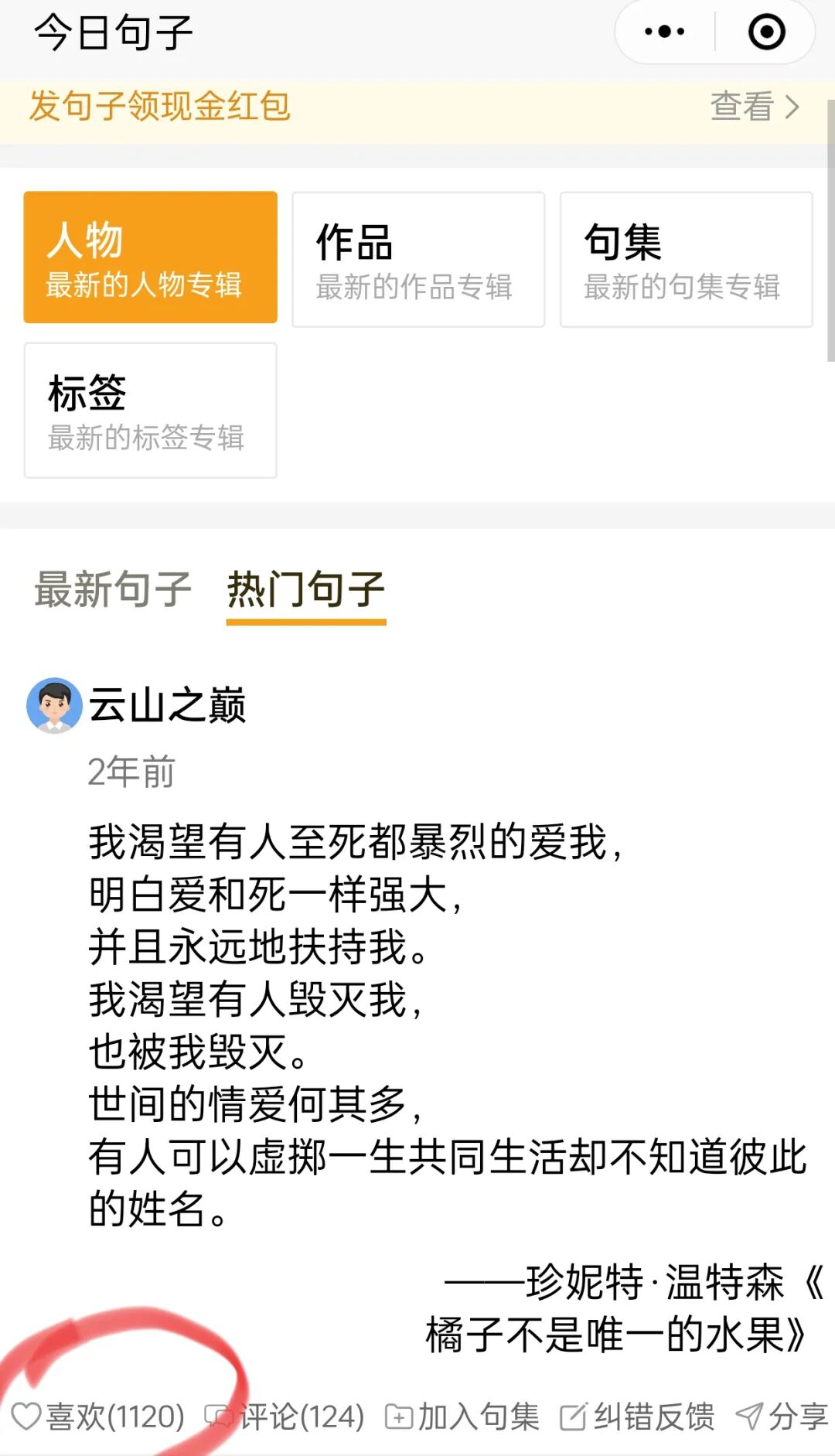 自己发布的句子或句子合集,如果被别人点赞,每个点赞奖励大约0.3元左右。这个奖励没有限制,点赞的数量越多,你获得的收益就越高。