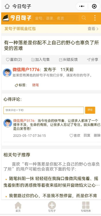 进入小程序发表句子就能获得奖励。主要还是说一下赚钱的玩法。