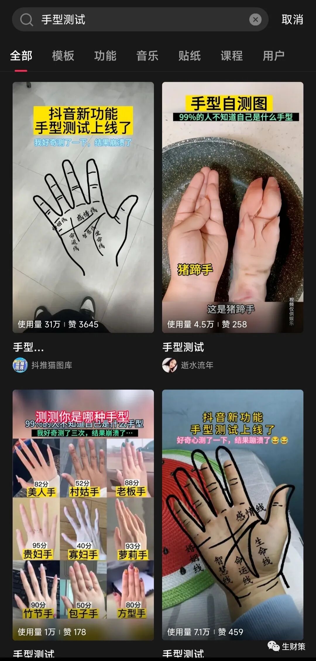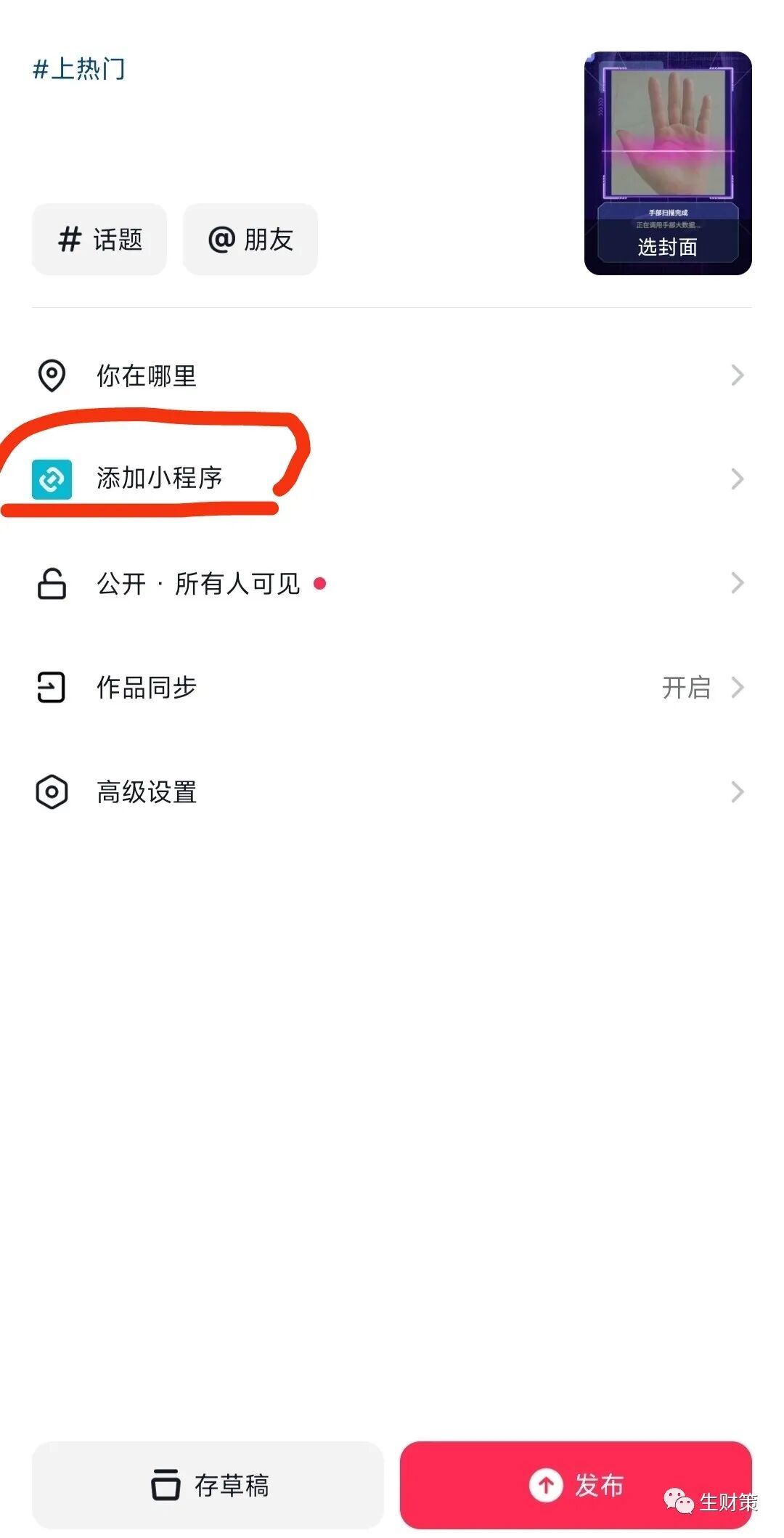 发布作品的时候,标题以及话题都要带上关键字,比如#手型测试、#测一测你是什么手型,之类。切记一定要添加小程序,别忘了!不添加小程序流量在高也没用!