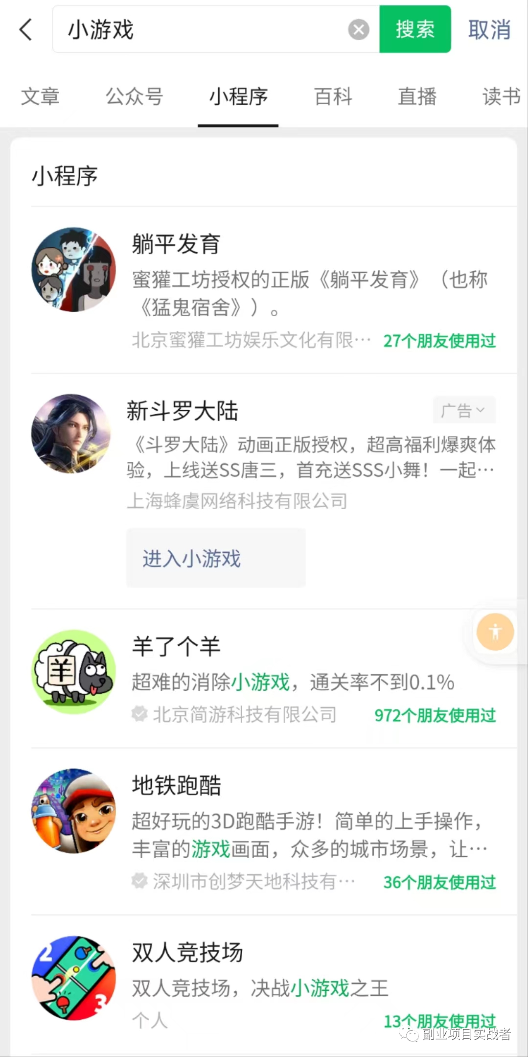 注册成功后,首要任务是明确自己需要做什么样的内容。小程序可提供多种内容,相当于一个APP,例如做影视、小游戏、资源分享等等。其中,小游戏最为常见、传播最快,可以借鉴其他人的做法。在微信搜索框中输入“小游戏”,会有很多相关的小游戏。