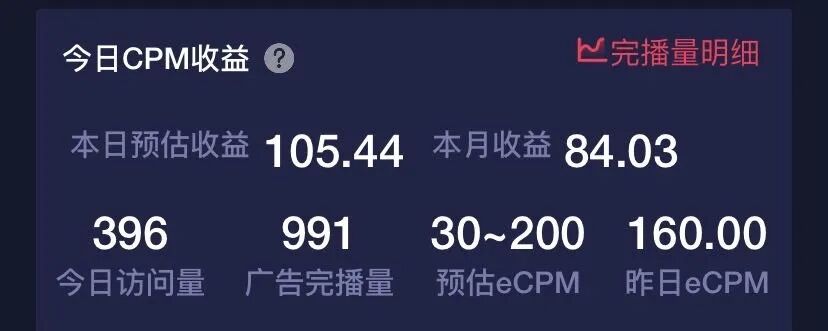 现在我们看一下抖推猫不程序的收益是怎么计算的,(如果不知道什么是cpm的,可以先百度一下,其实就是每千次广告播的价格,如下面这个160,指每1000次播放广告,广告主支付160元,相当于你的广告每播放完 一次,抖音就从广告主充值的广告费里扣0.16元,对了,这个钱是需要广告主先充值给抖音的,所以不存在无法结算的问题)
