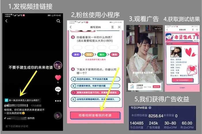 我们现在做的抖推猫小程序,都是心理测试和各种娱乐性质的测试,通过视频文案引导别人进入小程序,用户点击我们的小程序进去,做了测试,要看结果,会提示看广告,看完广告才会出来测试结果。