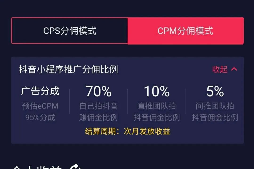 下面这个是其中一个小程序,他的cpm分佣比例如下图,广告分成95%,意思是这个广告费的95%是用来分佣的,自己发抖音视频的广告费是70%,如果是你下级发的你可以拿10%,如果是你下下级发的你可以拿5%。