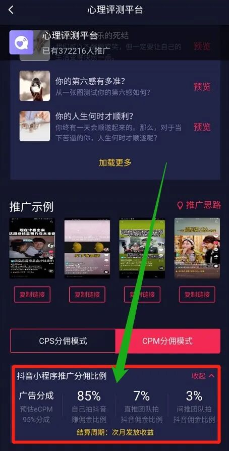 抖推猫有很多小程序,每个小程序的分润比例并不是一样的,比如下面这个是心理测试的,分佣比例是:85%,7%,3%