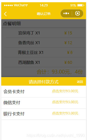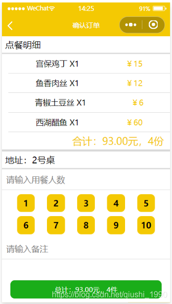 1,点餐明细2,价格计算3,桌号地址4,就餐人数5,添加备注6,点击下单