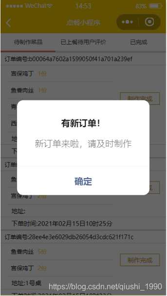 1,可以查看当前新下单2,完成后可以操作菜品完成3,可以监听用户新下单4,有新订单时会有语音提示5,厨师登录页语音提示我会在视频课里具体演示