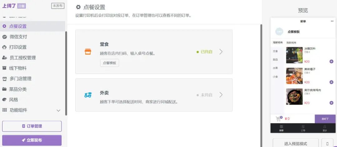 做完后,点击左下角的“立即发布”。按要求注册授权即可。现在你明白如何快速制作微信小程序了吗?就是这么简单。2.点餐外卖小程序有哪些优势一个点餐小程序对餐饮类商家帮助是很大的,消费者进入餐厅,就能通过桌面上的小程序码点餐并付款,避免排队等候,不但让消费者更方便,也大大减少了商家工作量。同时用户还能通过“附近的小程序”找到你,这样商家能通过微信获得更多流量。另外,微信小程序分享方便,商家能比较快地打响品牌,积攒私域流量。那么餐饮商家具体该如何利用微信生态经营店铺和品牌呢?这里给大家提供几个方法:3.用微信生态积攒私域流量(1)打造流量闭环商家可以建立起“公众号+小程序+视频号+微信社群”品牌矩阵,强化用户对你品牌和店铺的认同感。有新的餐品、新的活动时,可以通过公众号推文、朋友圈、视频等方式预告,吸引客户品尝。通过这种方式,商家能够和用户建立起更紧密的联系,直接触达客户群体,增强沟通效率,增强粉丝黏性。