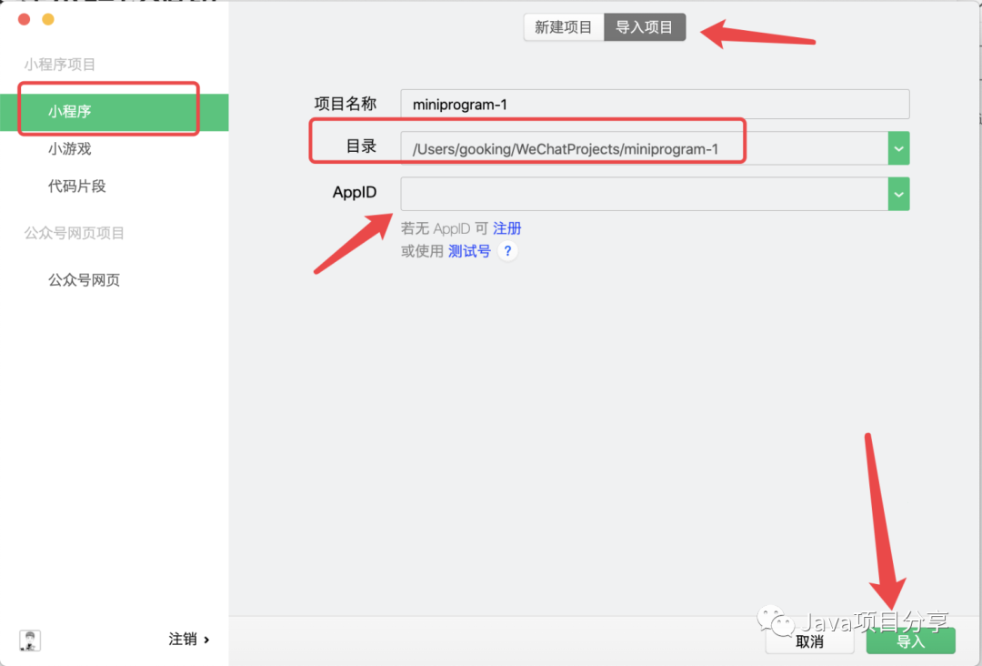 目录选择你 “第二步” 中下载并加压的小程序代码所在目录