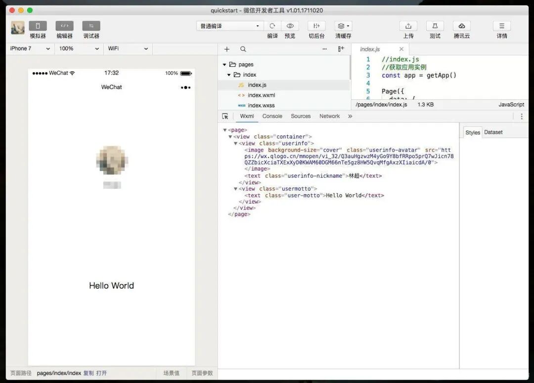 了解了这些知识后,你就可以正式开发了。下载微信官方开发者工具,新建一个小程序项目,填入你的小程序的 AppID(如果没有,需要先在微信公众平台注册个小程序账号,注册后在“设置”里你就能看到自己的小程序AppID),点击“创建 QuickStart 项目” ,你就可以编辑调试自己的小程序了。