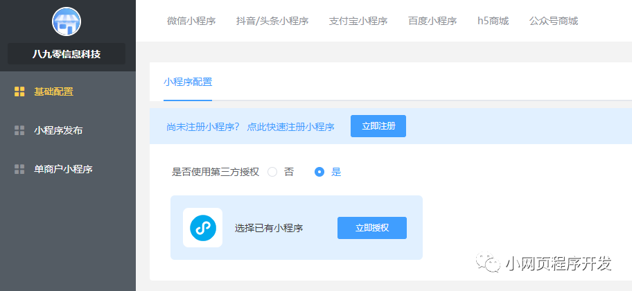 在顶部导航微信小程序授权绑定注册的小程序账号,提交微信审核,通过后小程序就可以上线了。
