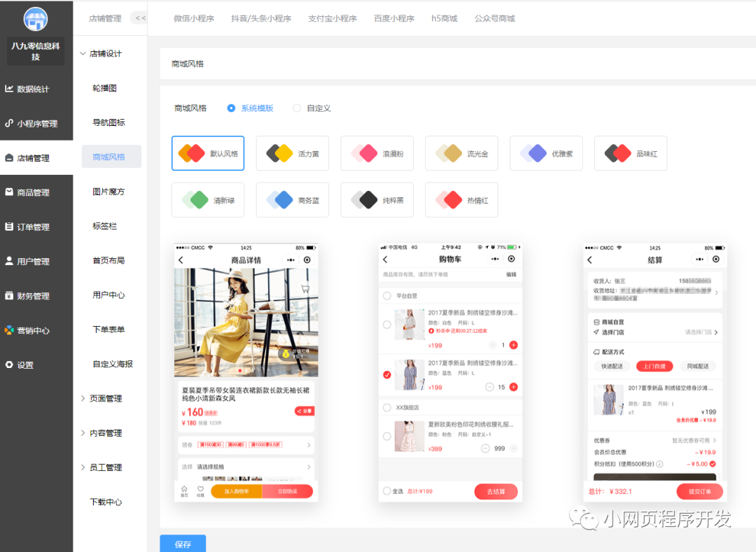 在店铺设计可以设置小程序风格,支持自定义设计风格