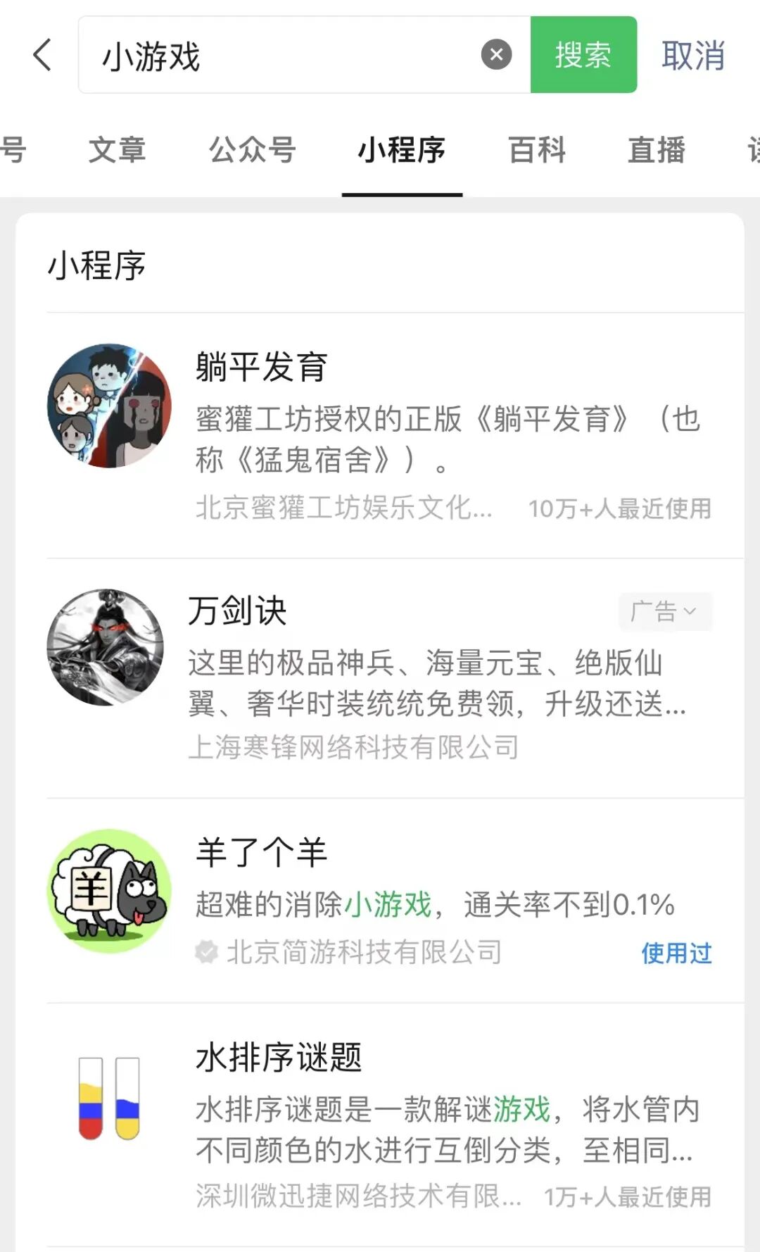**步注册成功后,首要任务就是明确自己需要做什么内容。小程序可以提供各种各样的内容,相当于一个APP,比如制作影视剧、小游戏、资源分享等等。其中,小游戏最为常见,传播速度也最快,可以借鉴他人的做法。在微信搜索框中输入“小游戏”,会出现很多相关的小游戏。
