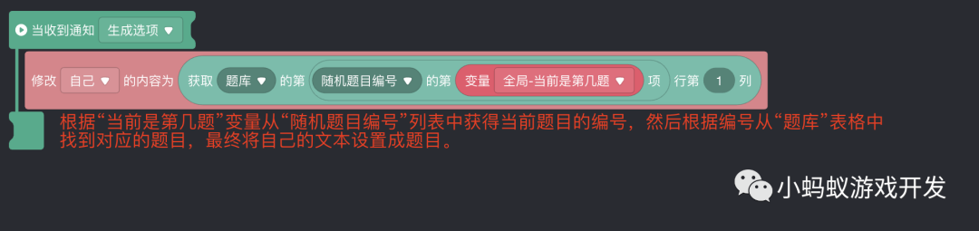这里我们只需要关注一个最核心的积木块,当点击选项时,比较局部变量“当前选项”中保存的列号,与正确答案的列号是否相同,相同的话则回答正确,不同的话则回答错误。