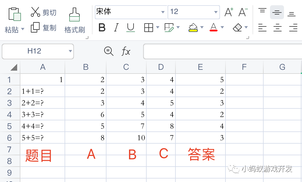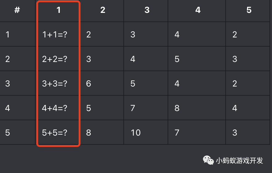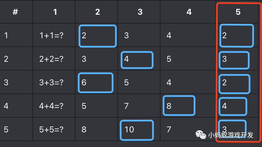 这里我创建了一个 5 行 5 列的表格,第 1 列是题目,第 2,3,4 列是选项,第 5 列是答案,答案中记录的是正确选项的列号。