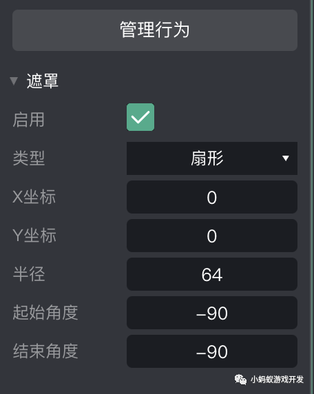 可以看到遮罩插件有很多的属性,这里我们使用“扇形”类型,用于实现一个圆圈的倒计时效果,利用遮罩插件可以实现游戏中的诸如血条,冷却等效果。