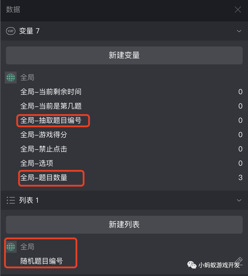 “随机题目编号”用于记录抽取到的题目的列表,“全局-题目数量”表示的是需要抽取几道题,“全局-抽取题目编号”表示的是当前随机到的题目编号。
