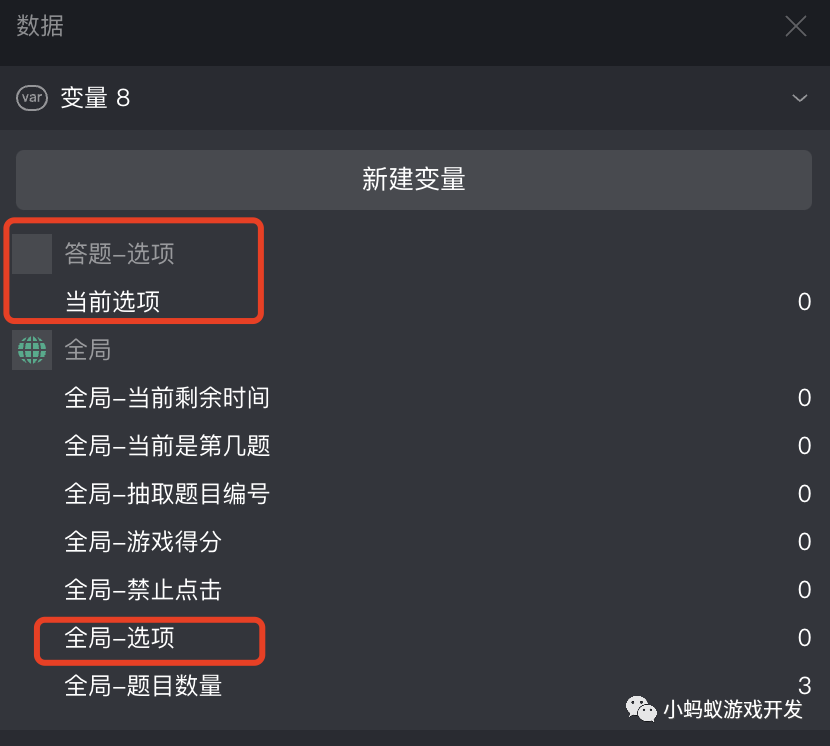 一个局部变量“当前选项”,用于存储当前选项在“题库”表格中的列号,全局变量“全局-选项”则用于在克隆体创建时设置其“当前选项”。