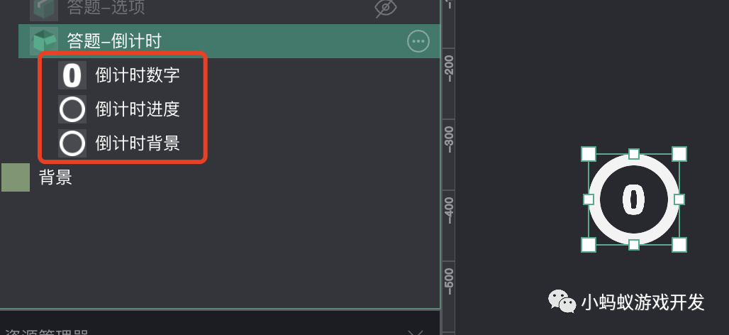 首先,来看一下界面和素材,这里将所有的与题目相关的内容都放在一个容器中,包含了题目,选项以及一个倒计时。每当出现一道题目时,上方显示问题,中间显示 3 个选项,然后下方显示剩余倒计时。