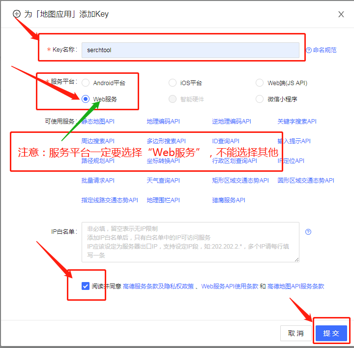 在添加Key窗口填入如下图的信息,注意:服务平台一定要选择“Web服务”。