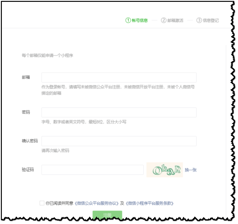 2、创建小程序 在公众平台的管理后台中创建小程序,填写小程序的基本信息,比如小程序的名称、AppID、Logo、描述等等,这些信息会在小程序展示时用到。 注册完成,需要邮箱激活,激活后还需要填写一些基本信息,我这里就不一一展示了,都完成后我们需要用到的是