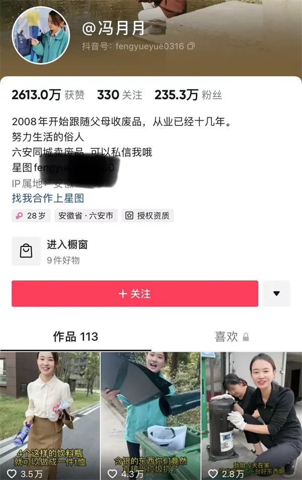 线下的情况我大致摸清楚了,我想线上一定有人已经在布局了,于是经过一晚上的研究,我发现了三个关于废品回收的大ip,果然是什么生意都能搬到D音上来做。